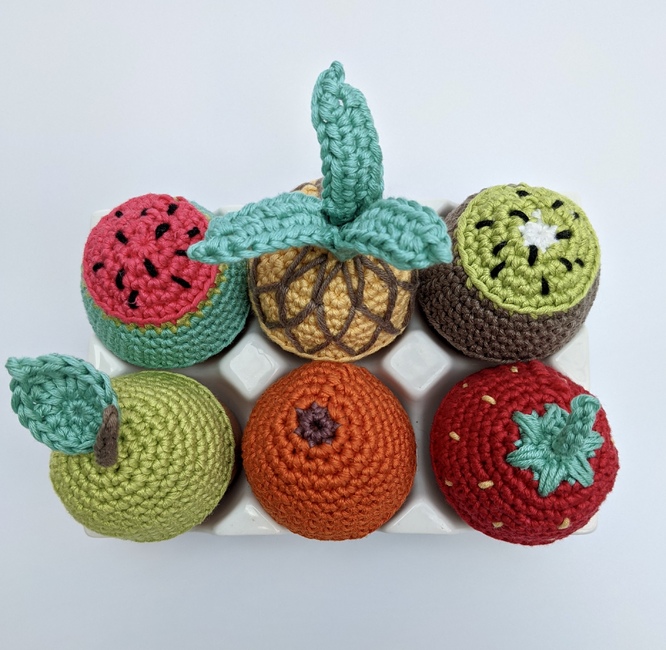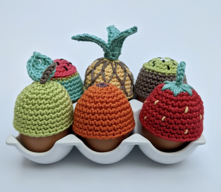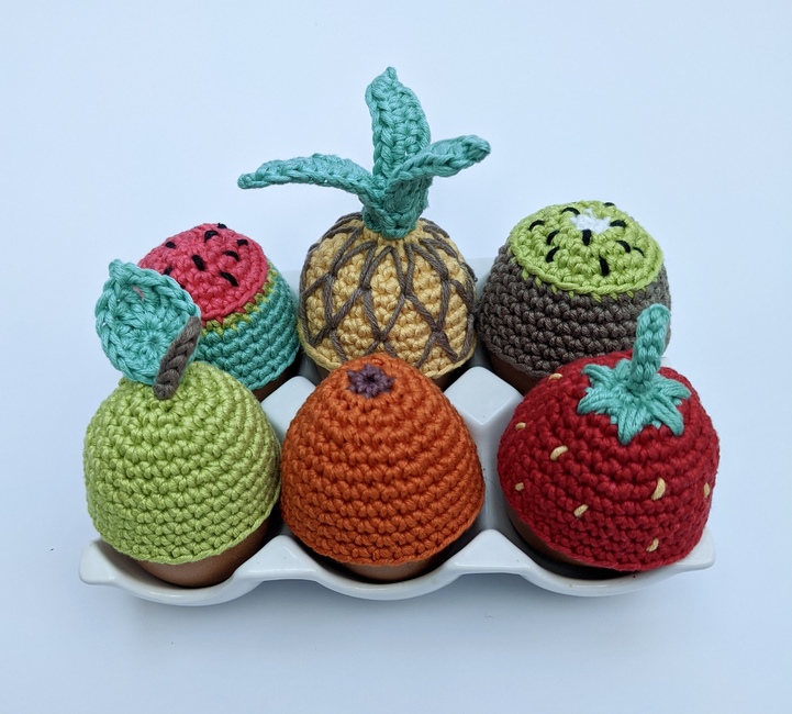 I love creating a set of patterns where each item is different so here is a pattern for six cute fruit egg cosies.