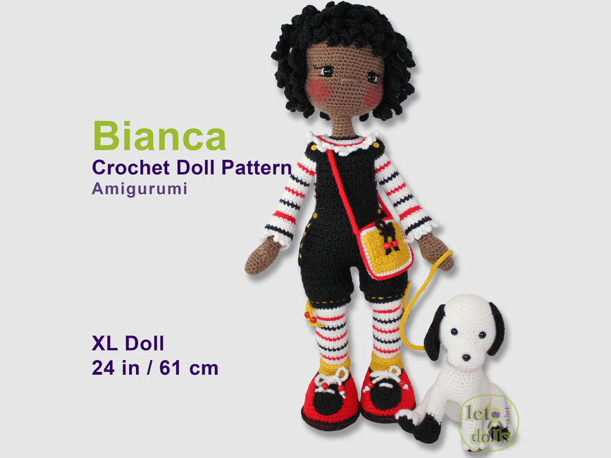 Bianca XLarge Crochet Doll is an Intermediate Crochet pattern designed by LetoDolls for making an Amigurumi. Create Bianca, a charming XL crochet doll who never goes anywhere without her bright red boots, yellow purse, and playful little dog, Beau.This pattern includes detailed, step-by-step instructions to make Bianca, her outfit and accessories, and he...
