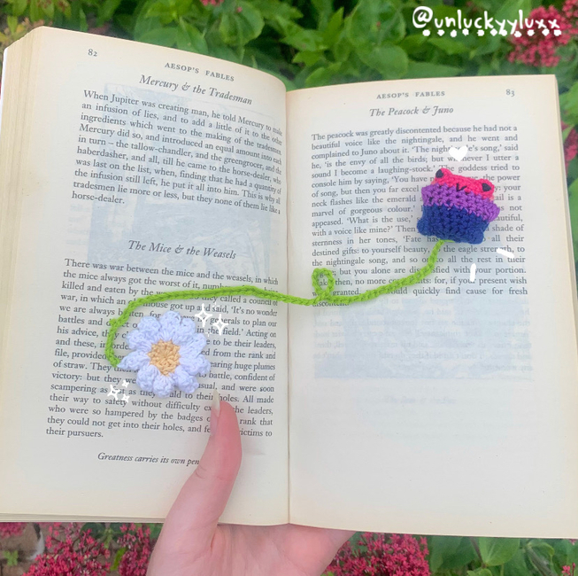 I used embroidery thread to make this whole design so he's very teeny, he makes a perfect little bookmark in my crochet ideas book, and I think you could probably even use him as a little bag charm too <3