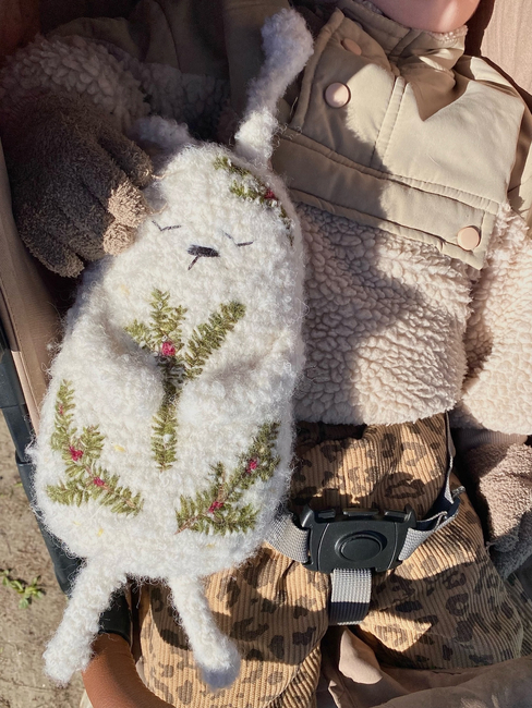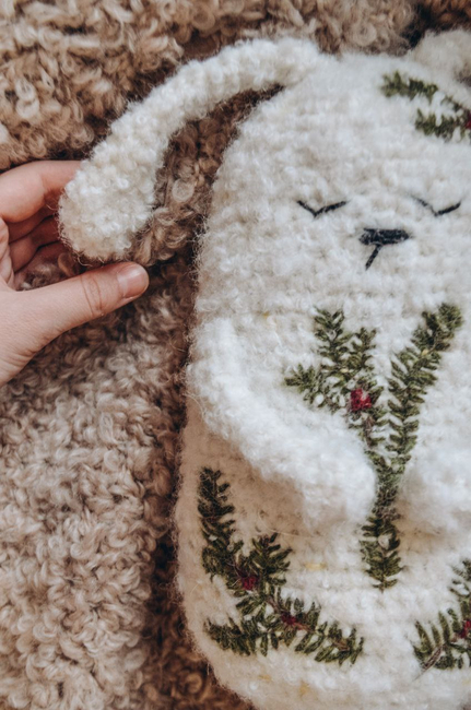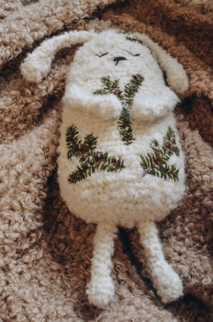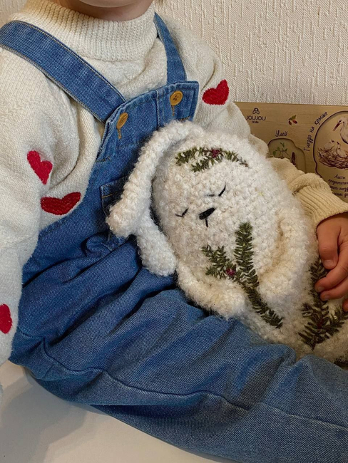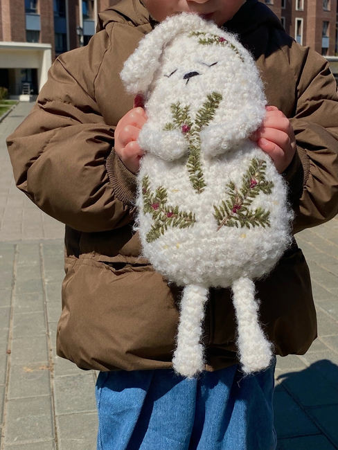 Keeper of the forest - is the crochet amigurumi pattern of big cute bunny with forest embroidery, from alpaca and boucle yarn. The bunny will be cool toy for little children (from 1-1,5 years).