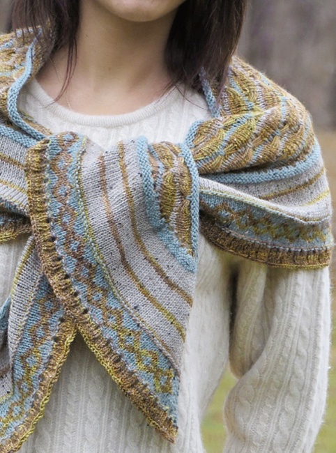 To make Birds in Flight Shawl 2330 you will need: Knit One, Crochet Too® yarnKETTLE TWEED . 100-gr/436-yd, 60% merino wool/20% baby llama/10% bamboo/10% donegal1 hank #4435 bamboo (A), Knit One, Crochet Too® yarnELFIN TWEED. 50-gr/208-yd, 60% merino wool/20% baby llama/ 10% bamboo/10% donegal 1 hank each #1810 lichen (B), Knit One, Crochet Too® yarnELFIN TWEED. 50-gr/208-yd, 60% merino wool/20% baby llama/ 10% bamboo/10% donegal 1 hank #1553 moor (C). Tools required: US size 6 (4mm) 30@Q circular needle, or size to obtain gauge.