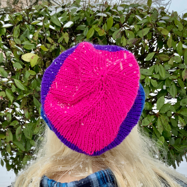 Show your pride with this simple yet stylish slouchy beanie! Worked flat with stockinette stitch and ribbing, it is a great pattern for beginners looking to branch out with some new techniques.