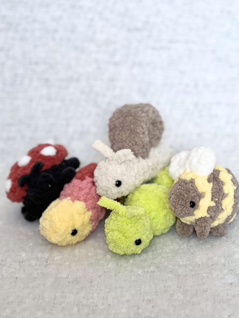 The following 5 patterns are included: Bitty Bee, Bitty Ladybug, Bitty Caterpillar, Bitty Snail, and Bitty Worm.