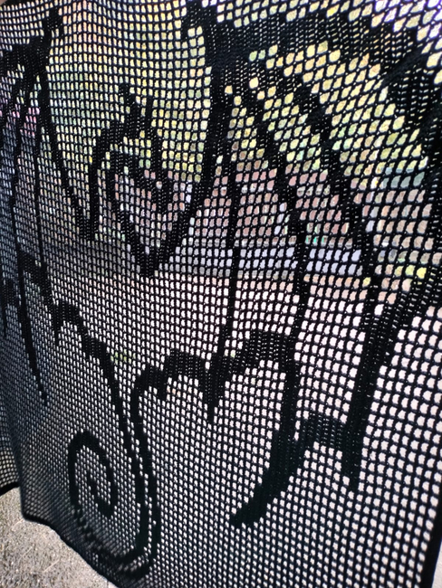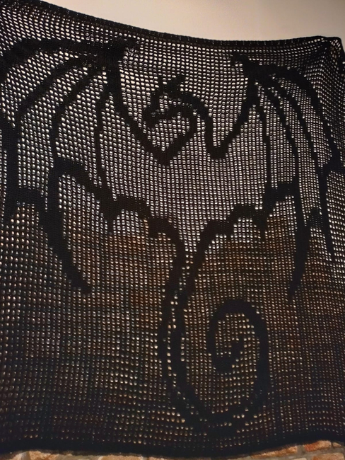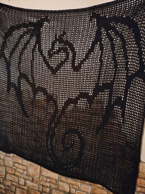 This is a filet crochet pattern with the image of the dragon built into a graph/chart from which you make the shawl.