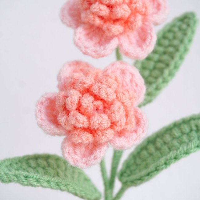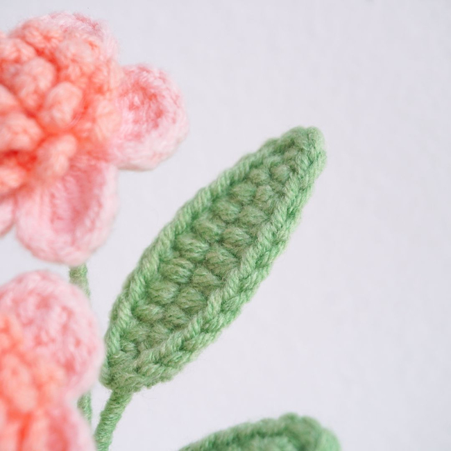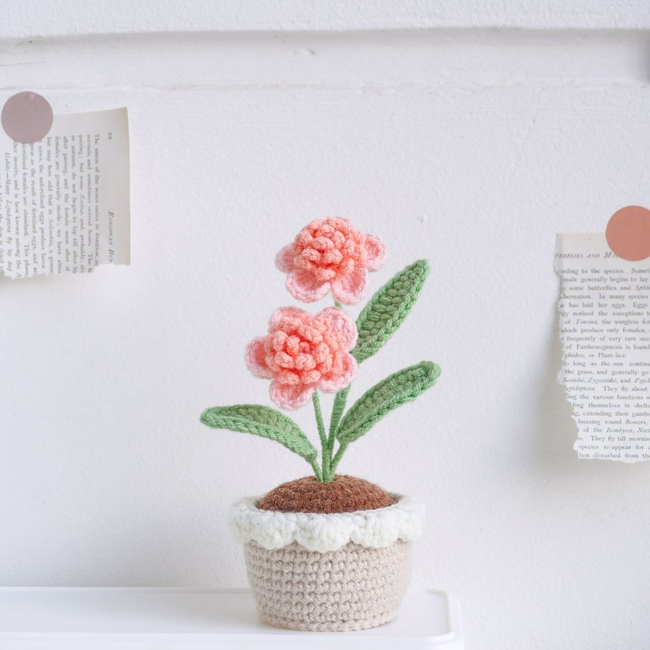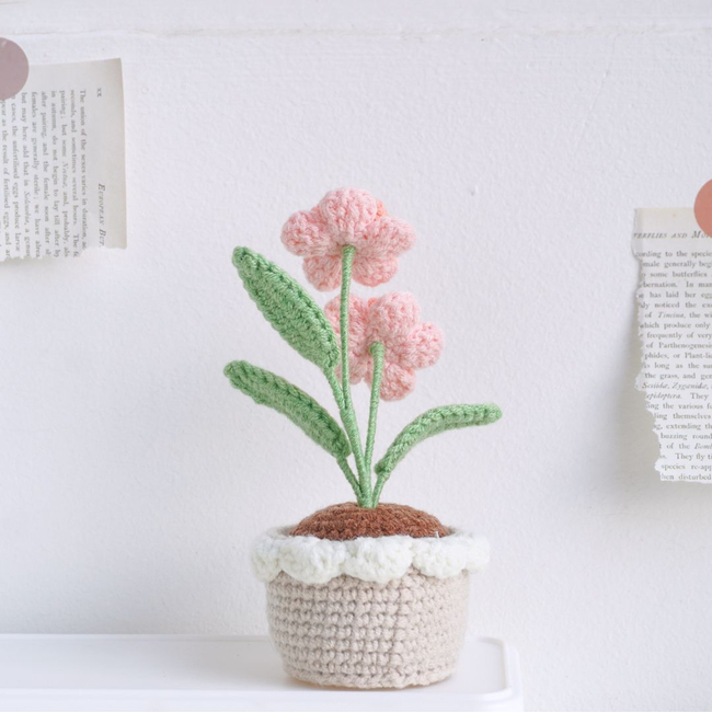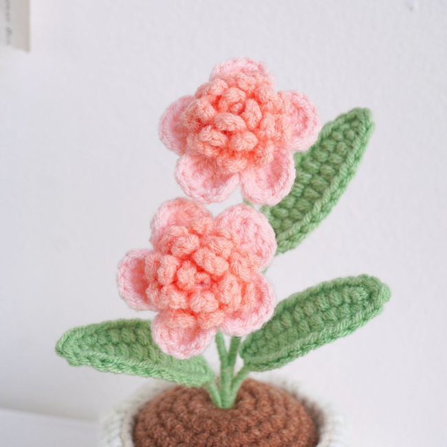 Unleash your creativity with the Blooming Pink Flower Pot Crochet Pattern PDF pattern! This Blooming Pink Flowers Pot showcases delicate pink blossoms arranged on green stems and leaves, creating a soft and romantic appearance. The flowers are beautifully textured, adding depth and detail. The neutral-toned pot with its elegant white edging highlights the delicate charm of the blooms.