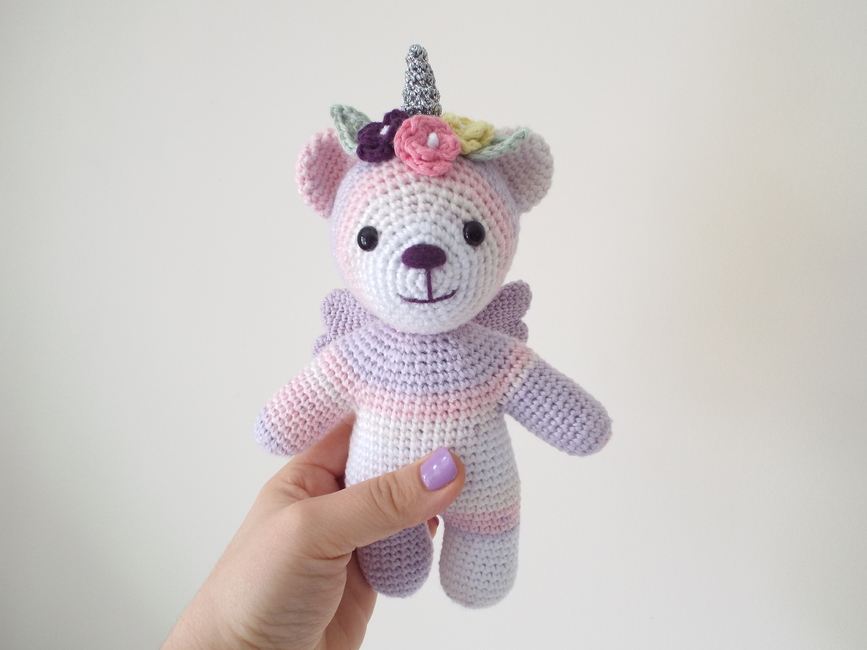 Using the materials suggested this bear measures 24cm. Any yarn can be used with this pattern with an appropriate sized crochet hook to create a tight tension, although other yarns may affect the size of the finished toy. Suggested materials: DK (8ply) 100% cotton yarn, 3mm crochet hook, toy stuffing and 9mm safety eyes.