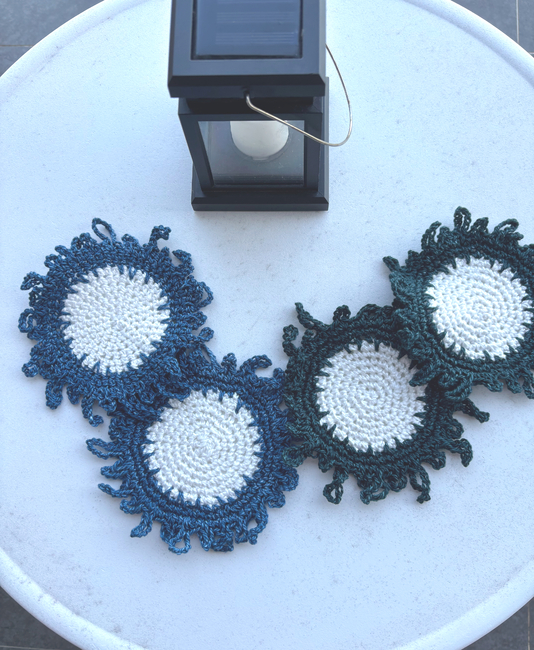 I love Blue Button Jellyfish and thought the design would be great for coasters! This is a simple pattern building on my other basic coaster pattern. So still a great pattern for beginners! It incorporates crocheting in the round, staggered increases and color changes. Uses Fine to Sport weight yarn.