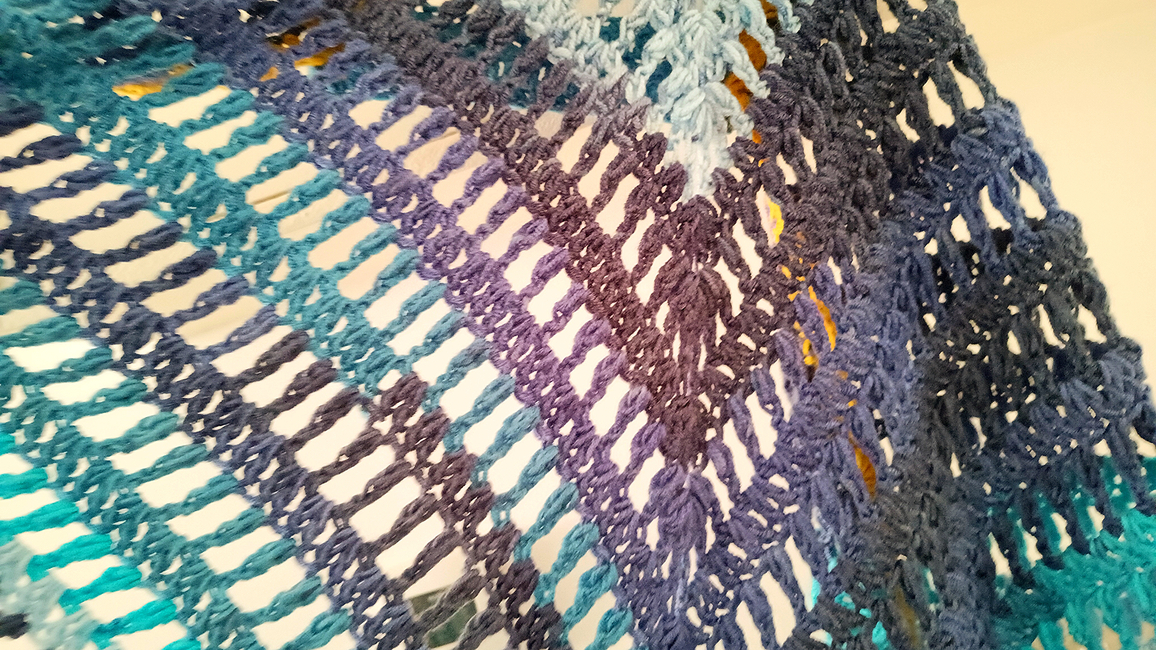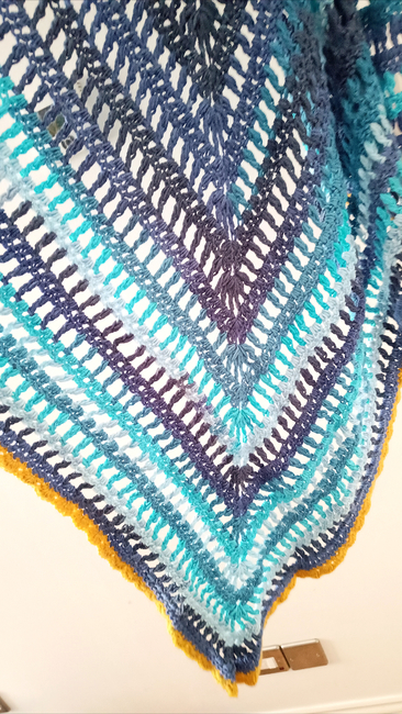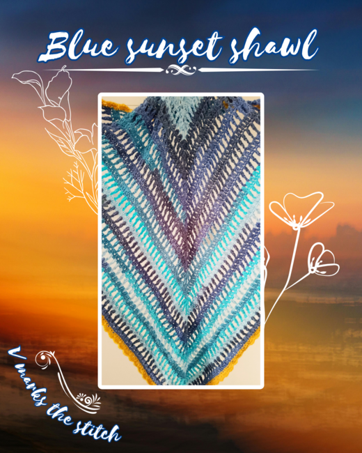 V marks the stitch designed the Blue sunset shawl pattern. Find more of their patterns on their Ribblr shop page.