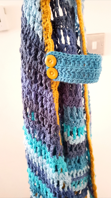 To make Blue sunset shawl you will need: Blue ombre yarn, you will need a few skeins depending how big you want your project to be, An additional colour for the edge, Buttons for the claps. Tools required: 4 or 4.5mm hook.