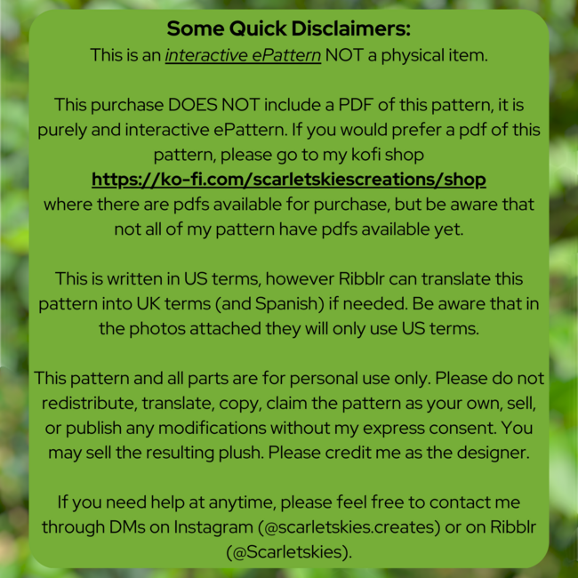 Leave a journal/review and tag me on Instagram @scarletskies.creates so I can see your little guy! If you need my help at any time, you can contact me through Ribblr or Instagram DMs.