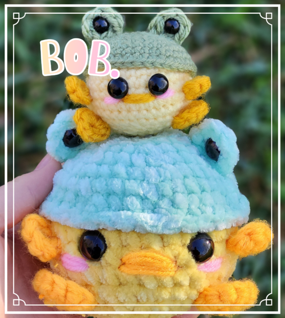 Bob. is a Beginner Crochet pattern designed by For the Love of Yarn for making an Amigurumi. Meet Bob. He is a big troublemaker, and the type of person who always busts out with those perfectly timed comments that make everyone laugh their heads off. This is a fairly basic duck with frog hat plushie. He's cute and froggy and has a hat......