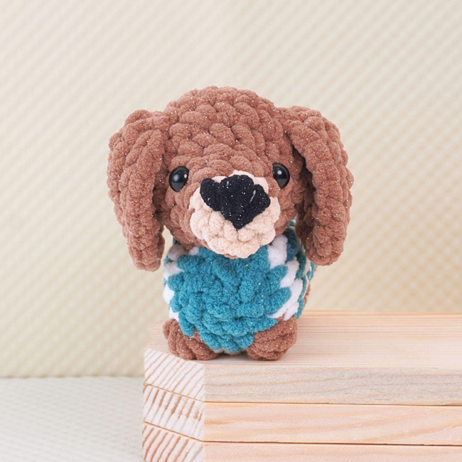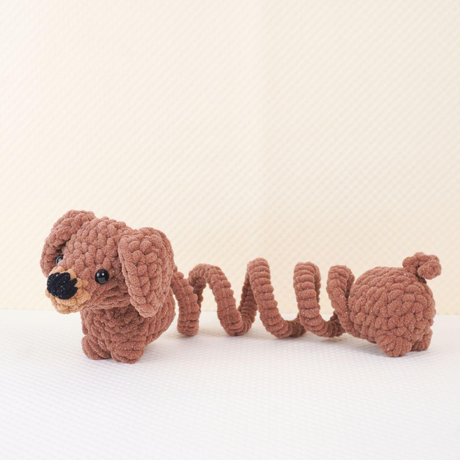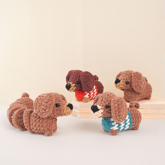 The Bouncy Dog Buddies set features a group of cheerful dachshunds with bouncy, rounded bodies and short legs. Each dog is dressed in a unique patterned sweater, enhancing their playful and colorful look. Their expressive black eyes, floppy ears, and detailed noses make them lifelike yet whimsical. With soft velvet yarn and carefully crocheted details, these buddies are designed to bring joy and warmth to any setting.