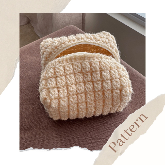 The pattern includes written instructions, photo guides, and short videos on how to make this chunky crochet box pouch.