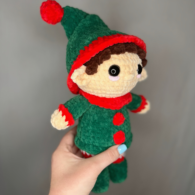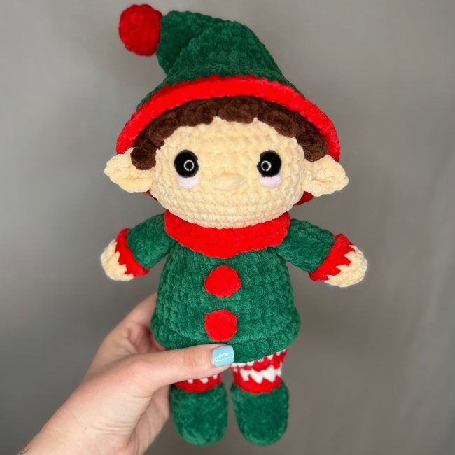 Shirt, arms, boots, and hat color (less than one skein of parfait chunky in color emerald) Hands, head, ears, and nose color (quarter of a skein of parfait chunky in color shell) Pants color (small amount of parfait chunky in color white) Hair color (small amount of parfait chunky in color chocolate) Blush color (small amount of parfait chunky in color cotton candy)