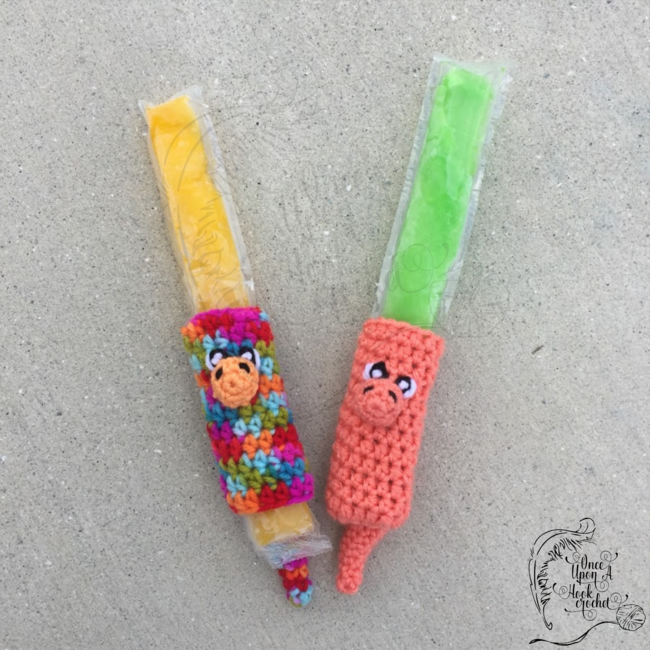 The instructions for this pattern include two (2) different body types for the cozy. One has a closed bottom, the prevents the popsicle from sliding all of the way through. The other is an open bottom, which allows the popsicle to slide all of the way through, allowing the cozy to sit at any spot on the popsicle.