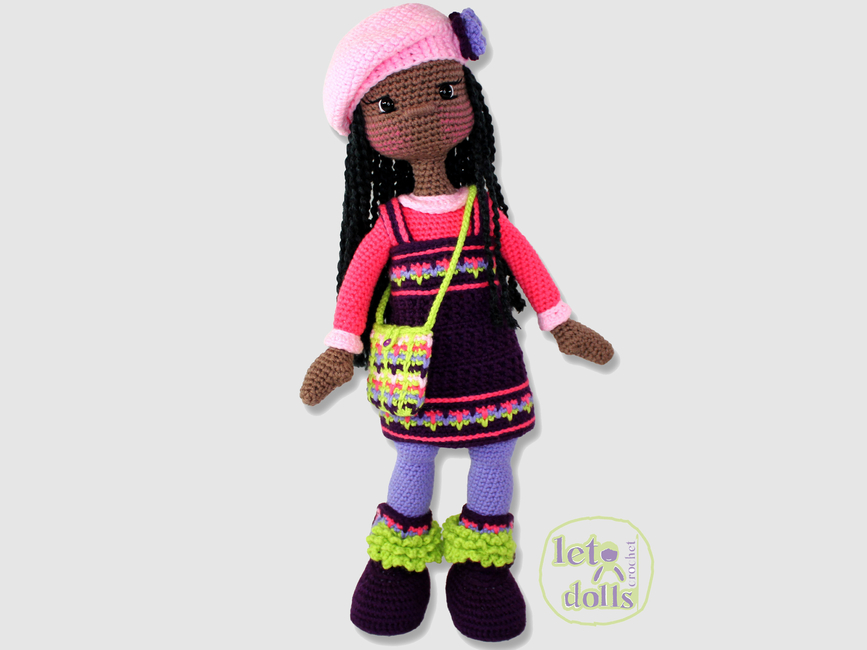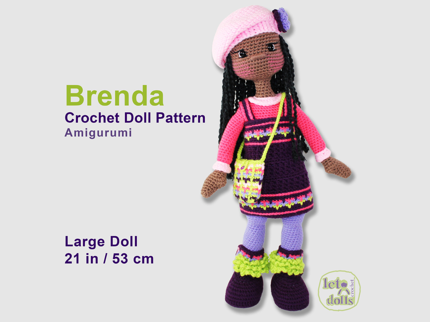 Create your own Brenda crochet doll with this detailed amigurumi pattern. This PDF crochet pattern includes step-by-step instructions and photos to help you make a large 21-inch (53 cm) doll with her dress, hat, bag, and leg warmers.