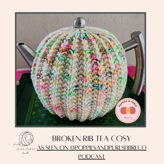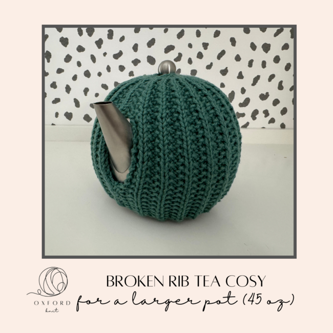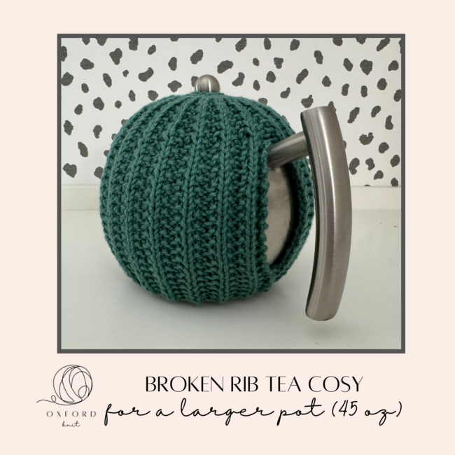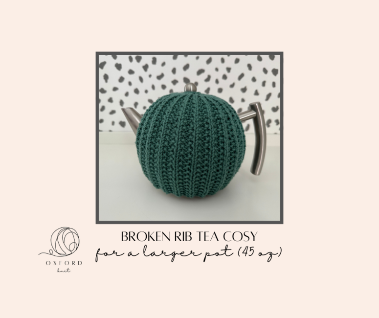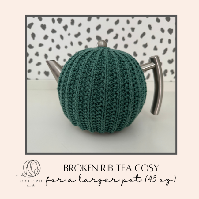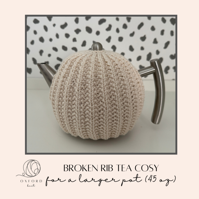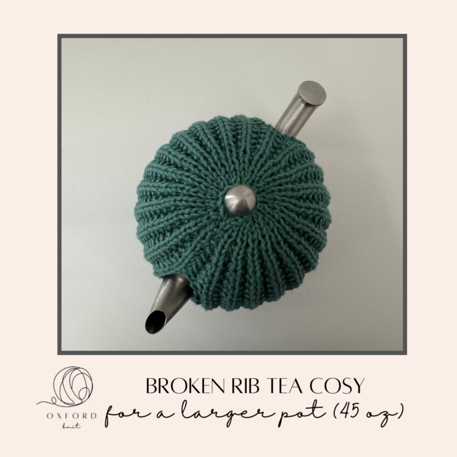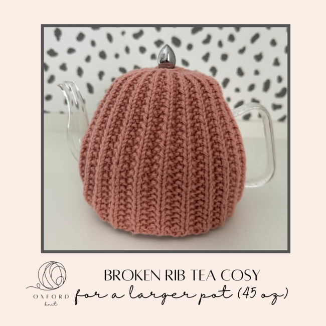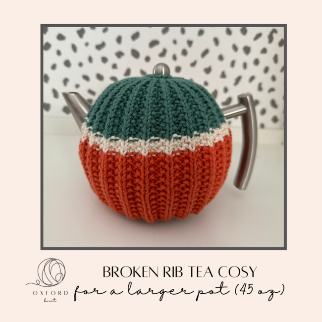 Oxford Knit designed the Broken Rib Tea Cosy for 45 oz pot pattern. Find more of their patterns on their Ribblr shop page.