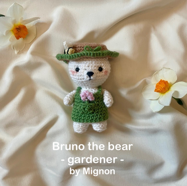 Mignon designed the Bruno the bear as a gardener pattern. Find more of their patterns on their Ribblr shop page.
