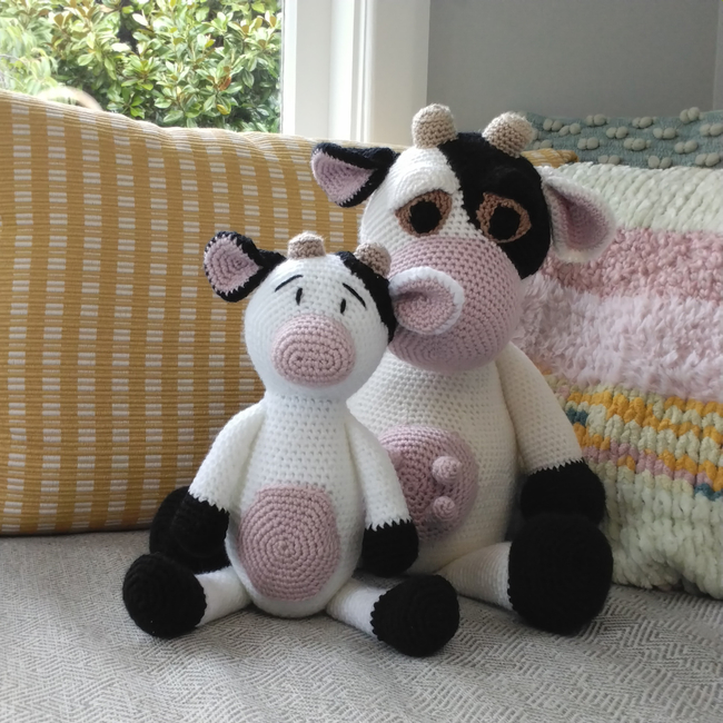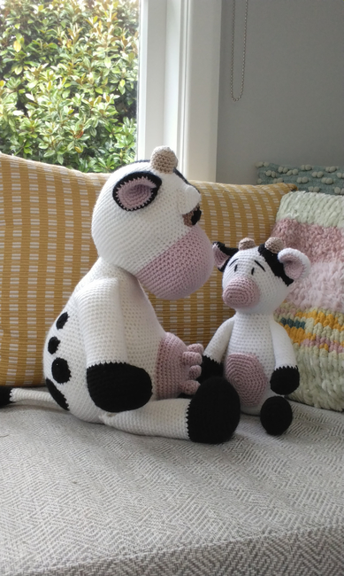 Make your cute family of Cows with this cute set of patterns. When Bubbles is made using the specified materials she sits at about 33cm, and is approx. 42cm from horn to hoof. Dot sits at about 23cm, and is appox 30cm from horn to hoof. Happy Crocheting!
