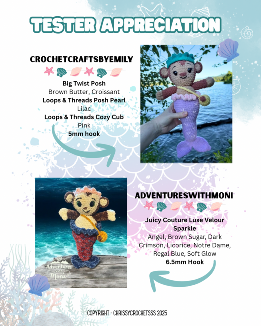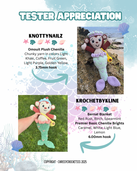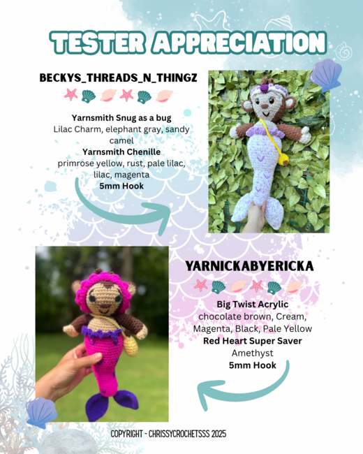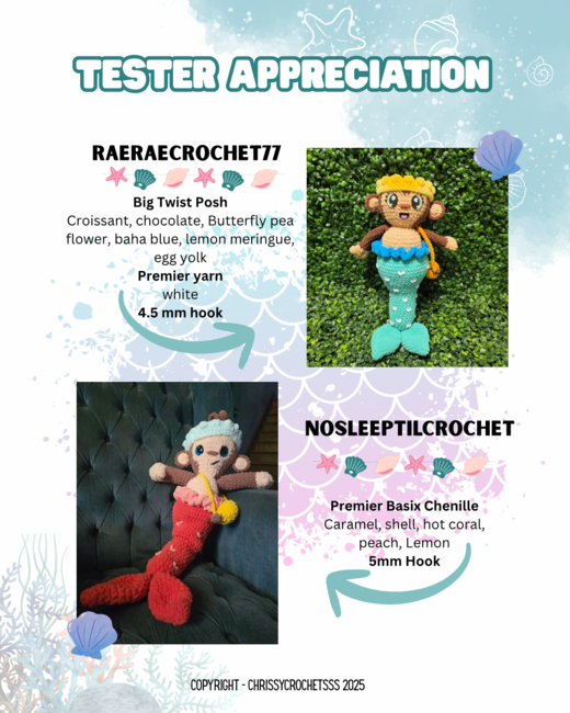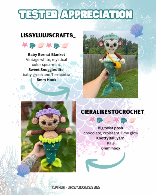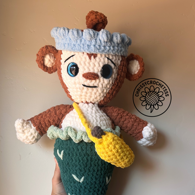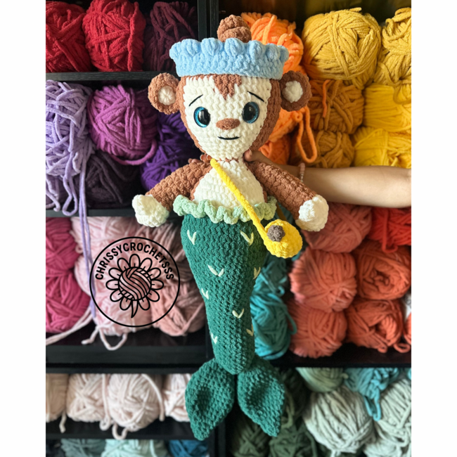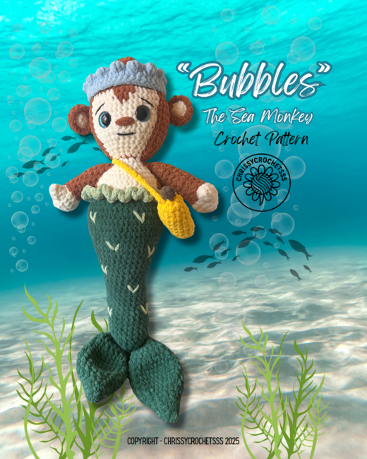 Half monkey, half mermaid, and ALL mischiefBubbles is the ultimate underwater bestie you never knew you needed. With her bubbly crown, swishy tail, and tiny sea satchel, she's ready to ride the tide straight into your crochet queue!