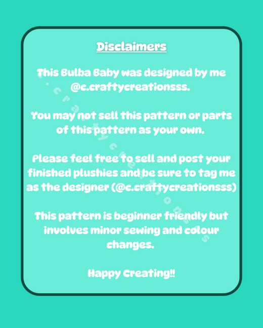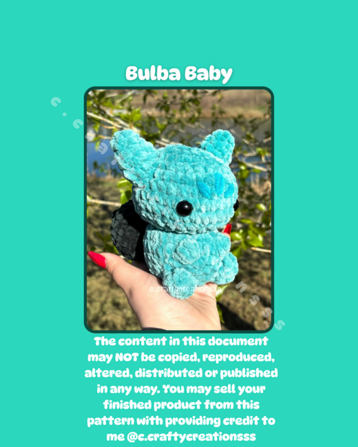 Bulba Baby is a Beginner Crochet pattern designed by c.craftycreationsss for making an Amigurumi. Hello!Thank you for supporting my business!For access to the pattern, please take a look at each of the photos.If you have any questions, please send me a message to any of the following accounts:Email: c.craftycreations11@gmail.comInstagram: c.cr...