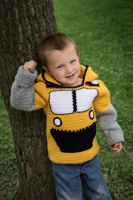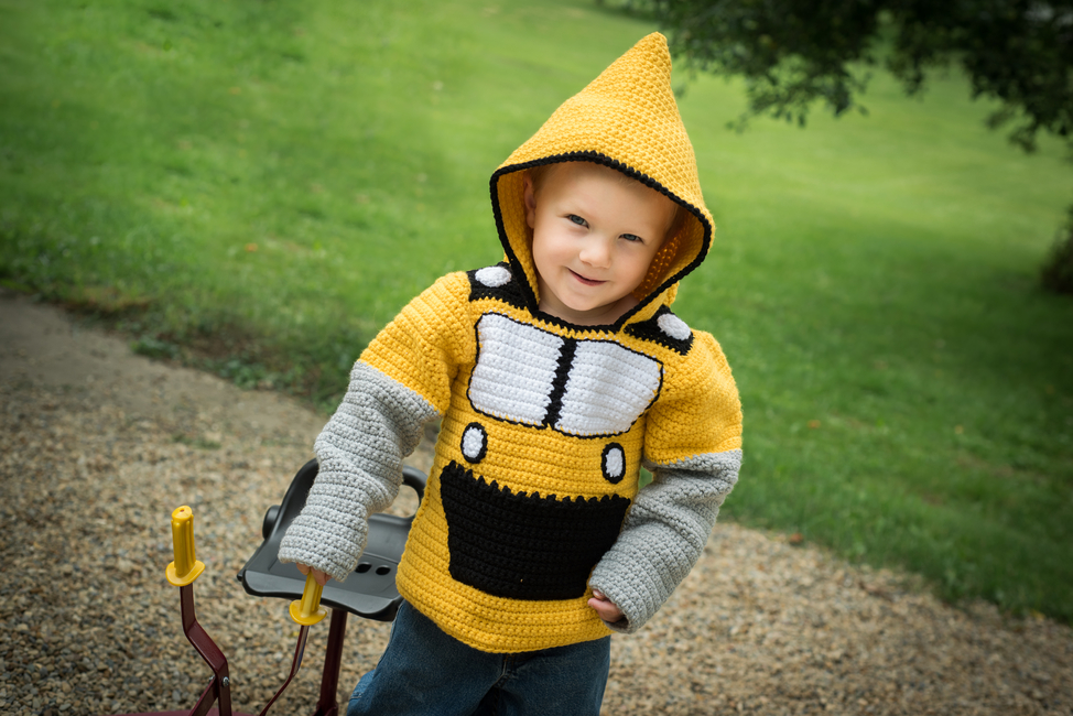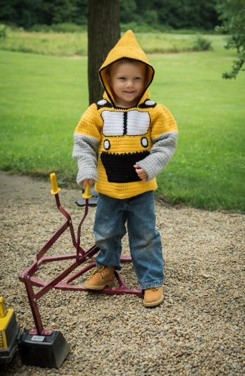 Your little boy loves playing with his toy bulldozer, and now he can BE a bulldozer. Make him this bulldozer hoodie with "hydraulic" gray sleeves and a "bucket" pocket on the front to hold his toys (or rocks). Your new pet project pattern includes detailed instructions, step-by-step photos, and color-coded charts to make this adorable unisex sweatshirt in toddler sizes. As a bonus for mom, the hoodie zips up the back, so he can't wriggle out when you're not looking!