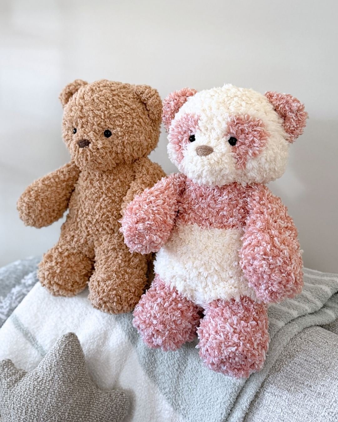 To make Bumble Bear you will need: Lion Brand Yarn, Go For Fleece in @qHoney@q - (approximately) 3.5 skeins (6.5oz each), Bernat Blanket Yarn in @qTaupe@q, PANDA: Lion Brand Yarn, Go For Fleece in @qCream@q - 2 skeins (6.5oz each), PANDA: Lion Brand Yarn, Go For Fleece in @qBlush@q - 2 skeins (6.5oz each), PANDA: Bernat Blanket Yarn in @qBaby Sand@q, Tapestry needle, Scissors, Stitch markers, Poly-fil / stuffing, 12mm safety eyes (optional). Tools required: 7mm (I used 6mm for blanket yarn).