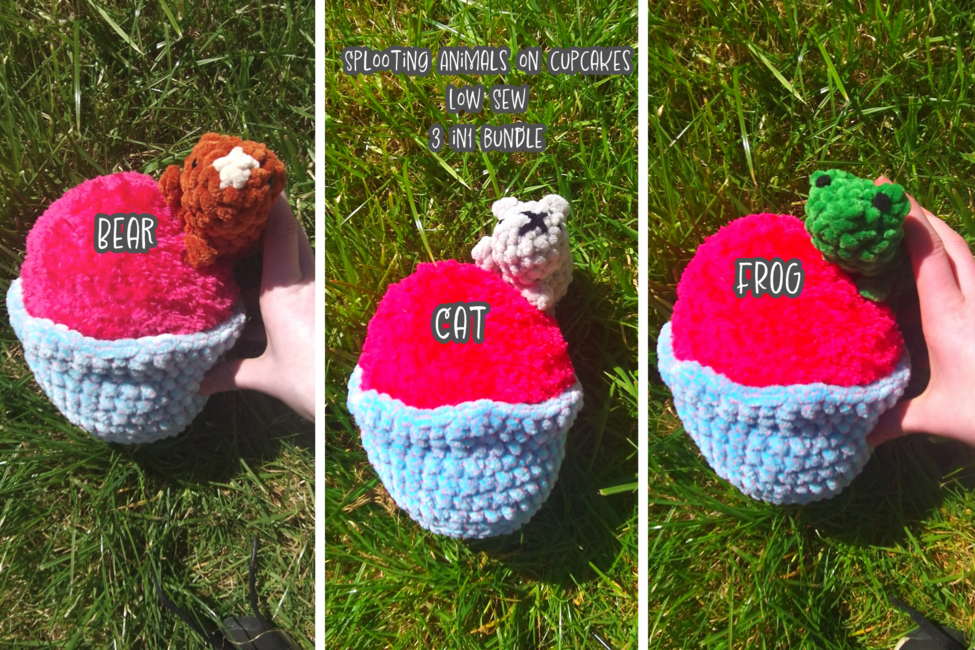 The (Bundle 1#) Splooting animals on cupcakes - Low Sew - 3 in 1 bundle pattern makes a Amigurumi. It is a Beginner Crochet pattern.
