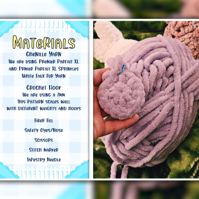 To make Bunny Buddies | 3 in 1 Crochet Pattern you will need: White, Blue, Pink, Magenta, Maroon, GreenWe are using Premier Parfait XLPremier Parfait XL SprinklesWhite Faux Fur Yarn, Safety Eyes, Optional Saftey Nose, Fiber Fill. Tools required: We are using a 7mm hookThis pattern scales well with different yarn weights and hooksPremier Parfait Chunky - 5mmBernat Blanket - 6.5mmBernat Blanket Extra - 10mm, ...Scissors, Stitch Marker, Tapestry Needle.