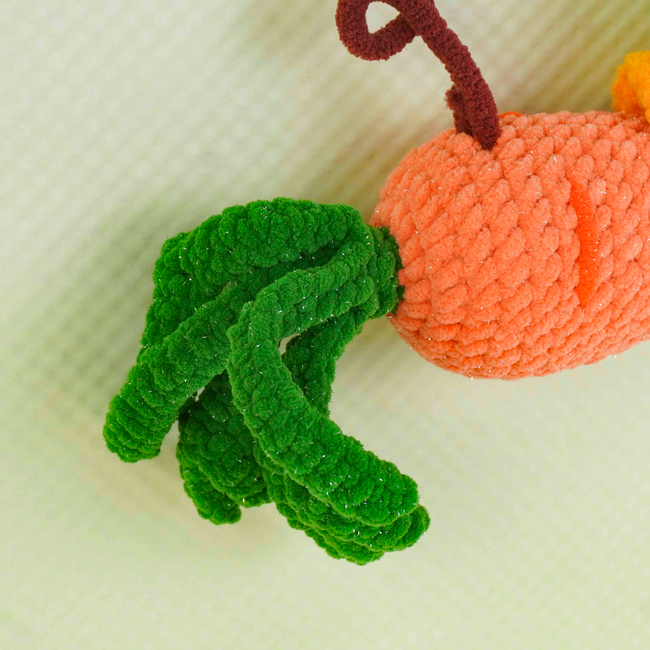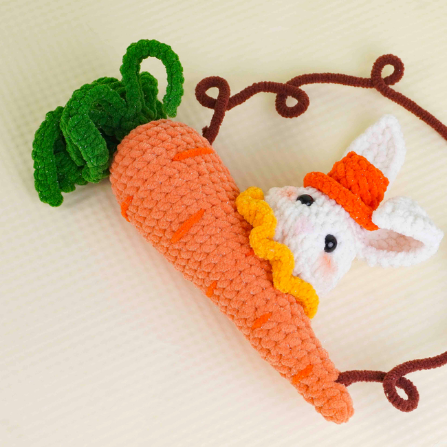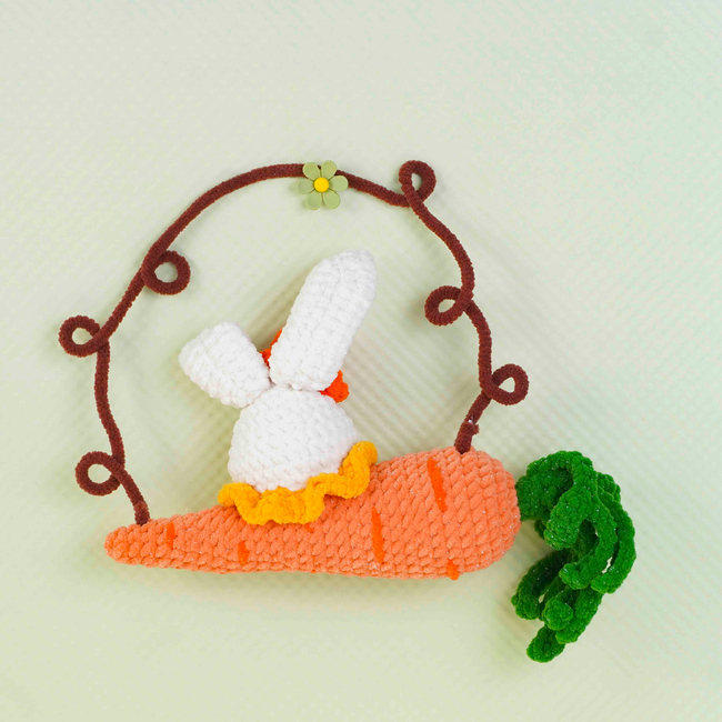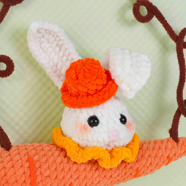 To make Bunny Carrot Door Hanger Crochet Pattern you will need: Color: White, yellow, green, orange, dark orange, pink, brown., Sewing needle Scissors Fiberfill Plastic safety eyes (10mm x2)MarkerPink powderWire (2mm). Tools required: 4.5mm.