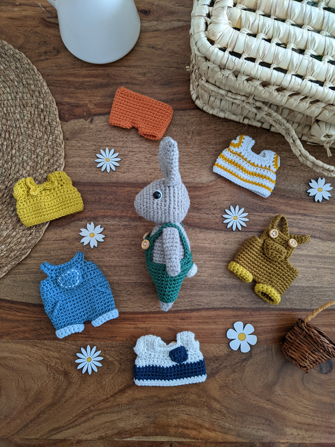 In this crochet amigurumi pattern, you'll find instructions to crochet the bunny + 2 shapes of overalls, 1 short, 1 t-shirt + various customizable options (pockets, revers, stripe patterns, waistline)