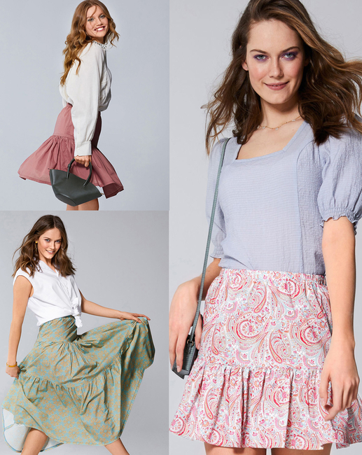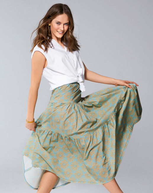 This maxi skirt has a very versatile style and looks completely different depending on what you wear with it. Sandals and blouse create a romantic and feminine look, while a tank top, cowboy boots or Doc Martens lend an air of coolness. For a sporty style, wear a T-shirt and Chucks. Some like it short. But not mini. Their ideal choice - this dusky-pink cotton skirt, beautifully feminine, but not too sexy. And the best thing is that this frilled skirt is an all-rounder that you can even wear when there's a nip in the air - teamed with a sweater or cardigan and thick tights. This cute mini puts everyone in holiday mood with its fresh print, which goes perfectly with the frilled style. It also looks great with a denim jacket. Finally, don't forget a golden rule of thumb - the shorter the skirt, the flatter the shoe!