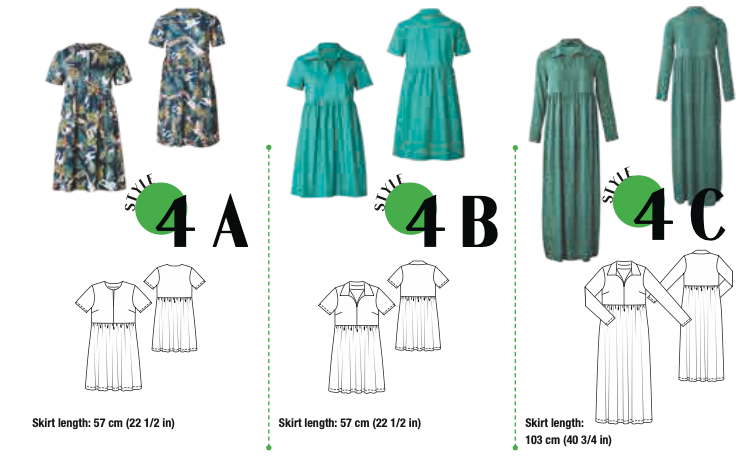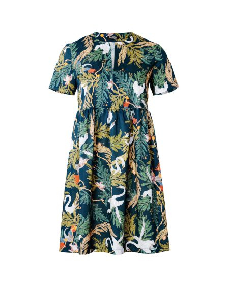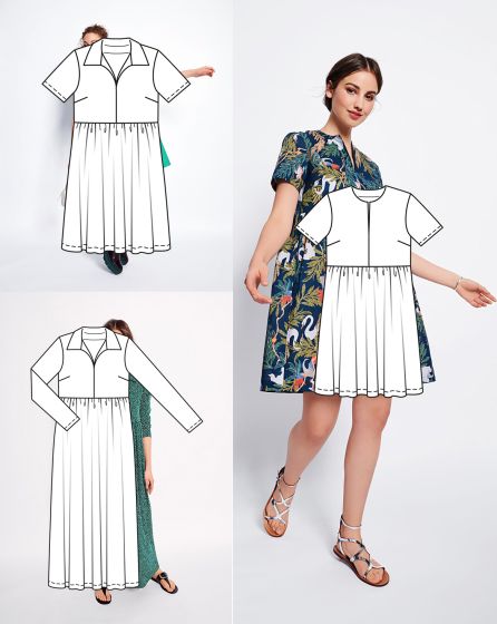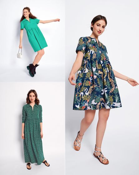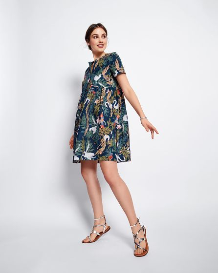 A: The cute mini dress with a tunic neckline (no collar!) and rich print is a real eye-catcher. The high waistline creates an appealing silhouette and is perfectly comfortable as well!