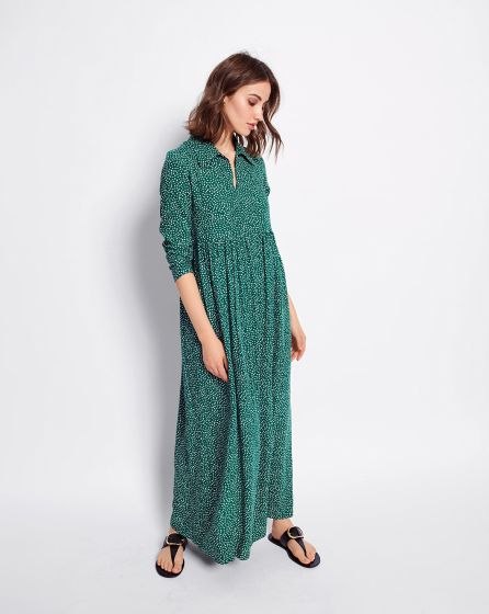 C: With a collar, too, but in the extra-long version with long sleeves and made from flowing fabric with dots: the maxi dress has an elegant, feminine vibe.