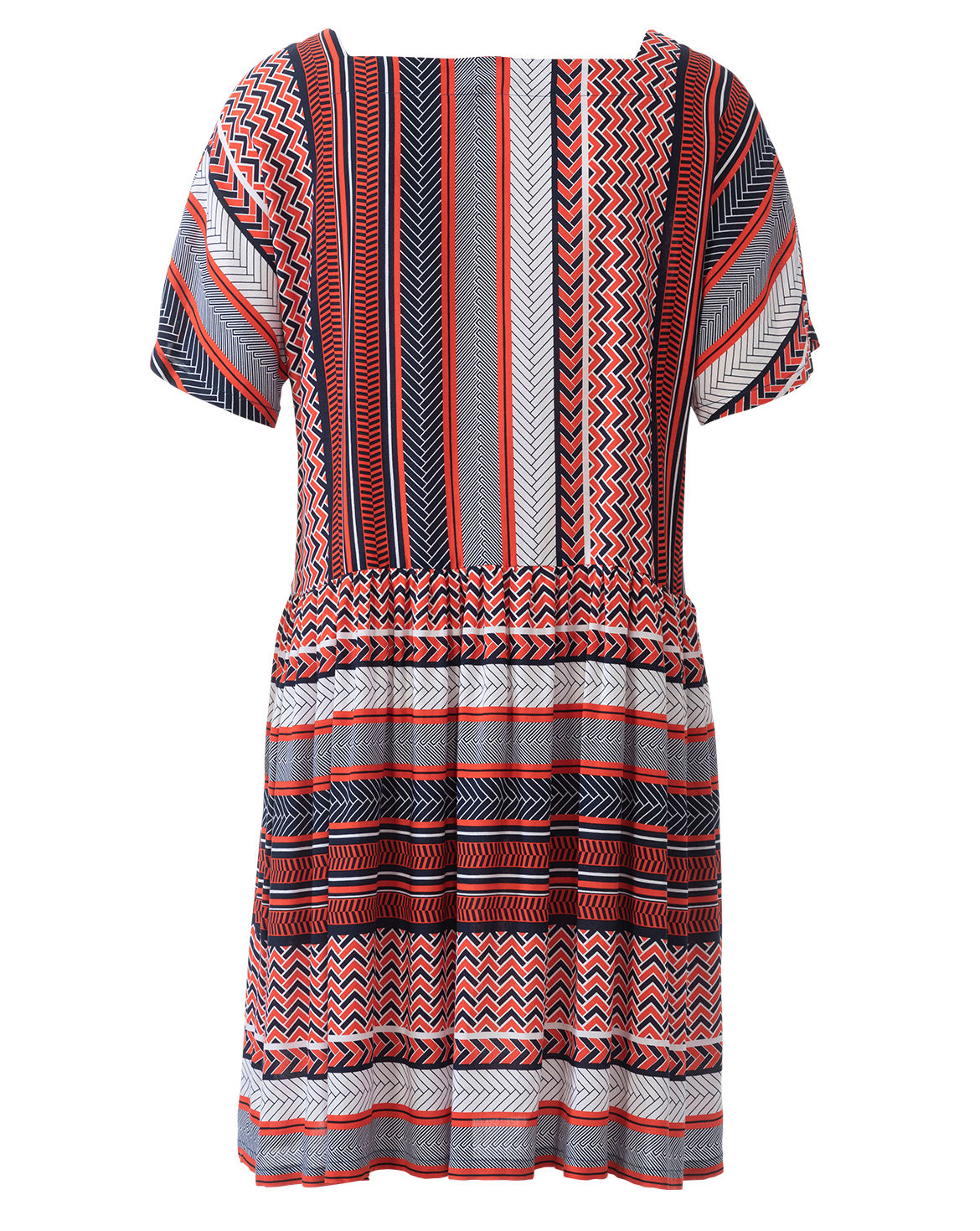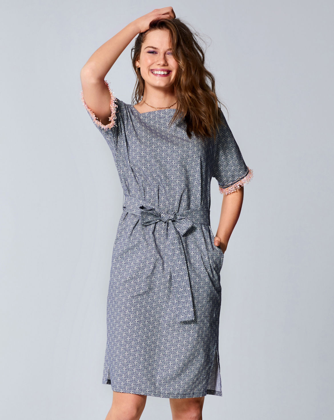 Crop tops are a flattering way of showing off your figure and are very trendy right now. And this top is a real key piece for the summer - thanks to its boxy shape, the square neckline, the cotton embroidery and the fringe trim with an ethnic flair. At the first glance the shift dress with a tie belt is simple and comfortable. At the second glance super details such as side seam pockets and cute fringing on the sleeves are revealed. Tip for cooler days - a long cardigan made of light knitwear or a leather biker jacket. The style of this dress is so comfortable that it gives you the freedom to do just about anything - lounge around, enjoy a feast, do a cartwheel. If in doubt, just wear a pair of denim shorts underneath! Nice effect - the horizontal and vertical stripes.