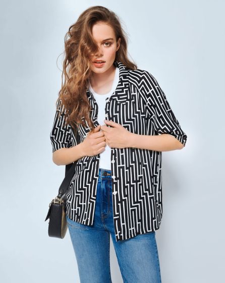 C: Cool jacket substitute on hot days: Thanks to its length and 1/2 sleeves, this casual shirt model is perfect for wearing open on top of a vest. Make it even chicer by buttoning up and combining the long shirt with trousers!