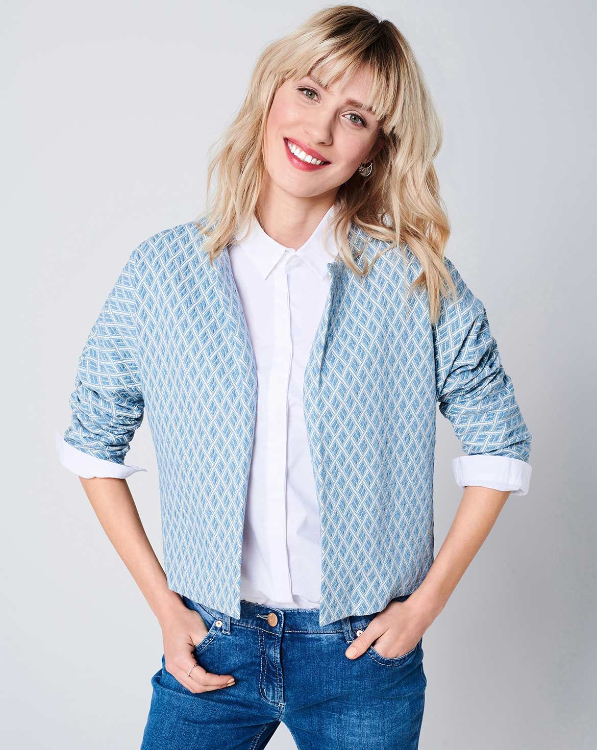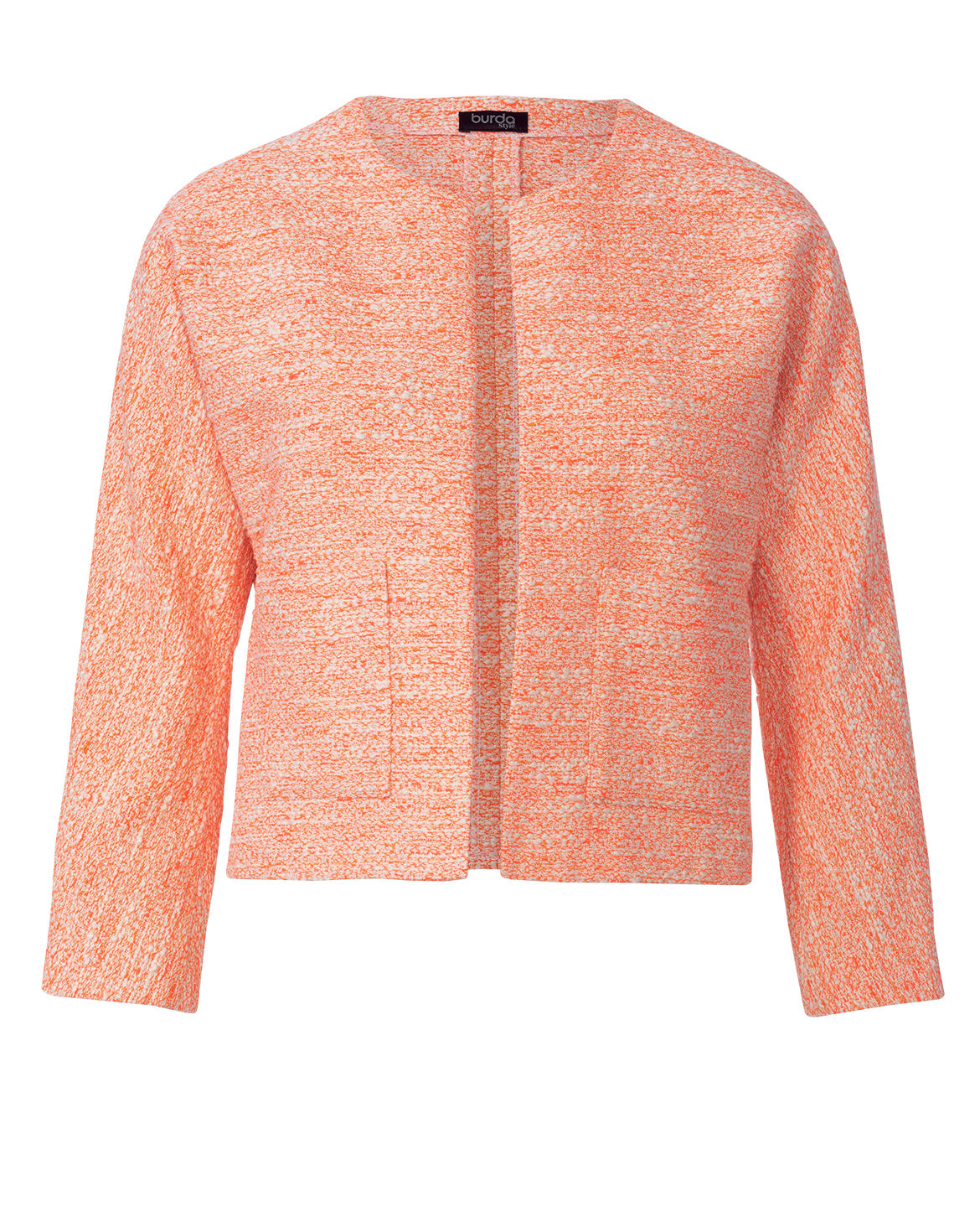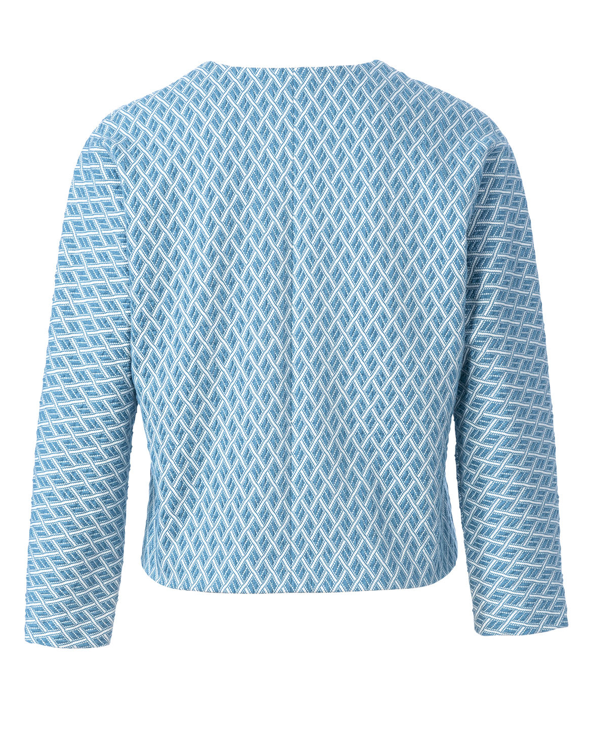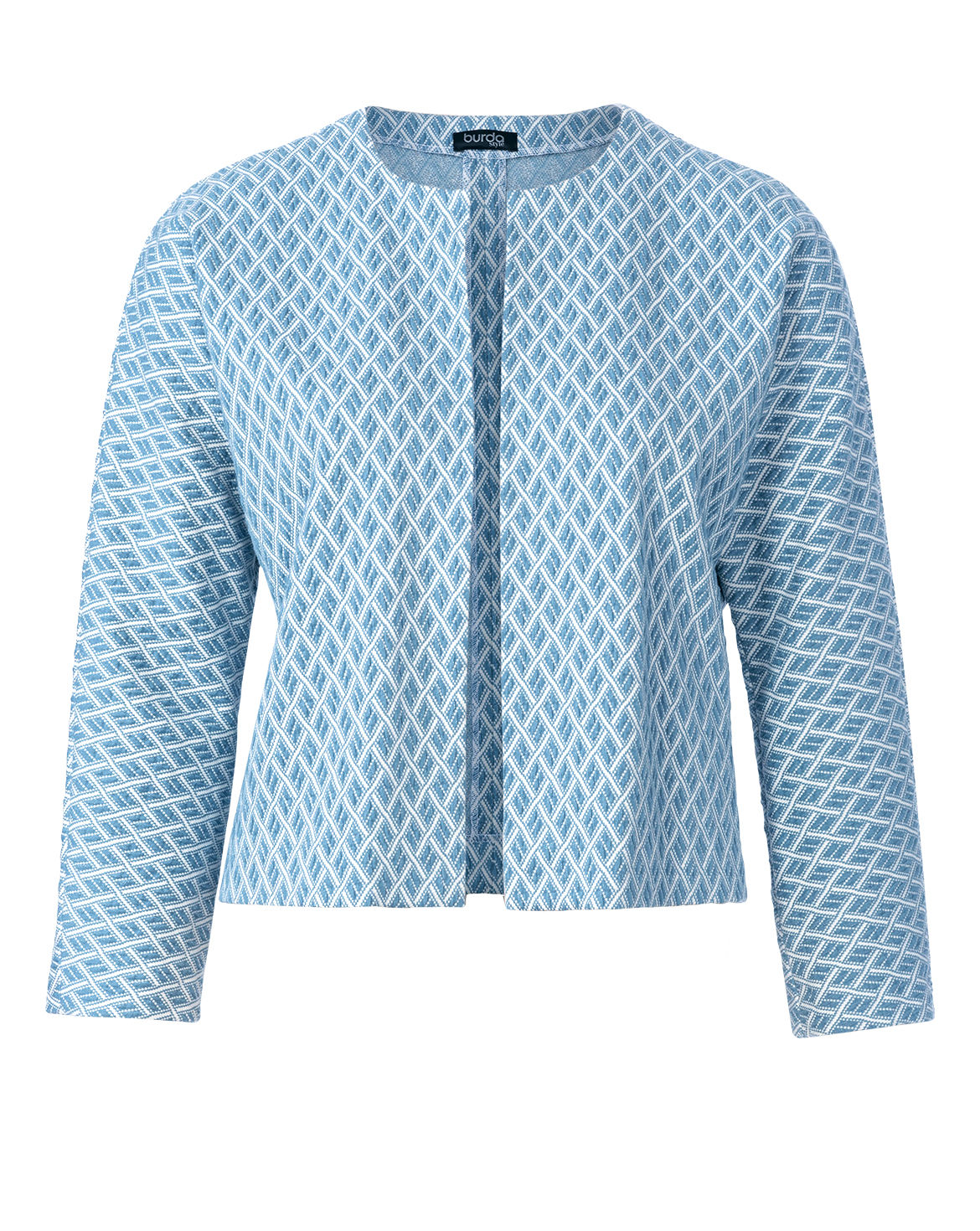 A: Looking for an elegant alternative to a biker jacket or jeans jacket? Look no further... This jacket in jacquard jersey is lightweight, casual, and comfortable - and combines well with jeans or a wide summer frock!