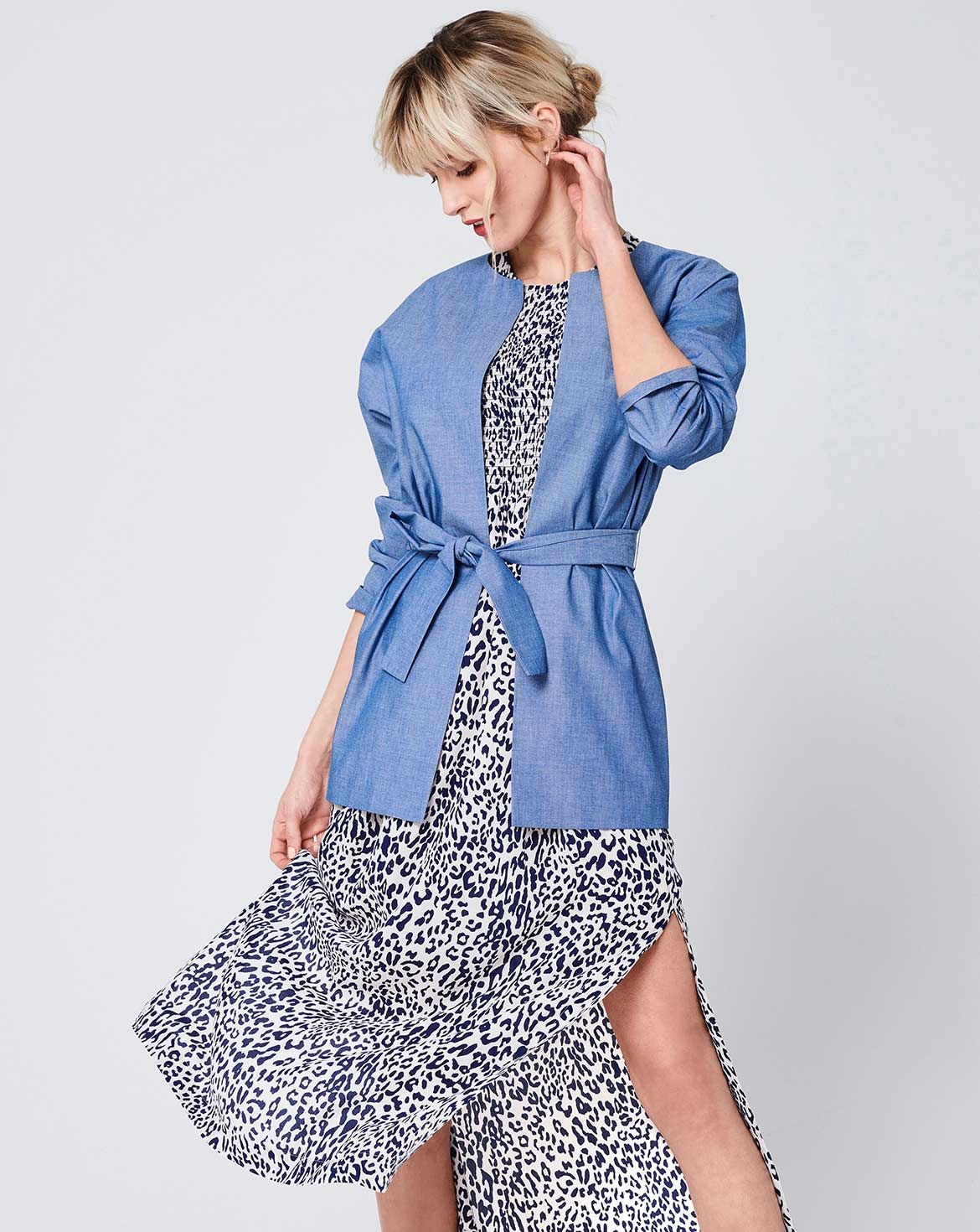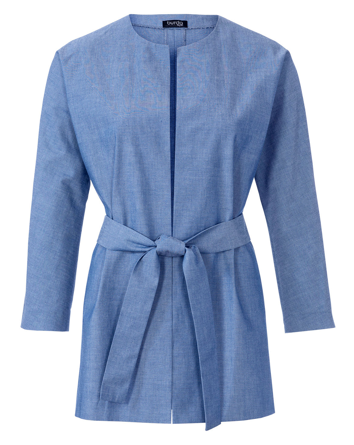 B: Denim can look very fine, as this model shows. The jacket's length helps to elongate your figure and the tie creates a feminine silhouette. Helpful hint: Tie the belt at the back when you're not using it.