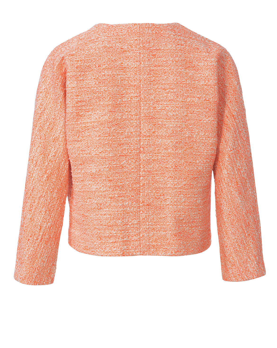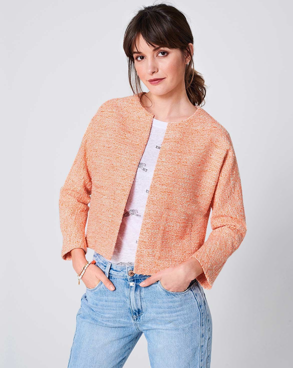 C: Bouclé always looks elegant - as Coco Chanel was well aware. The look becomes ladylike yet casual if you Easy lots of long beads or brooches and a simple white t-shirt with this jacket.