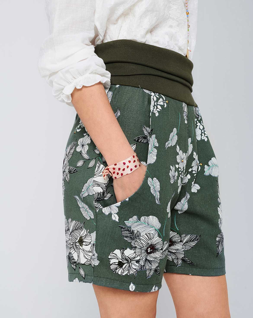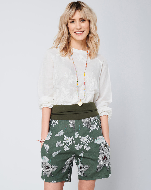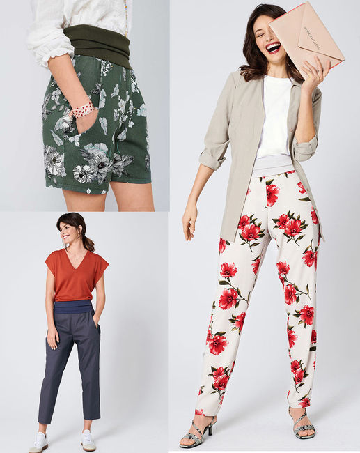 B: Shorts in the ofï¬ ce? With these elegant Bermudas (made of sustainable fabric), why not? Thanks to a wide elastic waist-band they're comfy, the side pockets are very practical and easy to sew! By the way: in our video tutorial, we show you how to sew this model step by step - simply scan the QR code below with your smartphone camera!