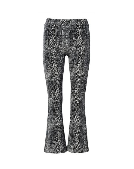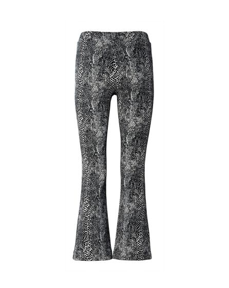 A: The shorter the hem, the smaller the flare: Stretch leggings with a snakeskin print and a flared, 7/8 length for those who like the look. Styling tip: This hem shape and length are also super with chunky tied boots.