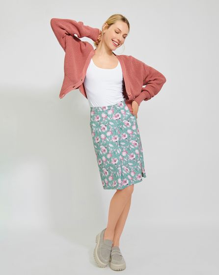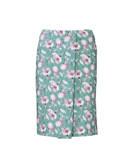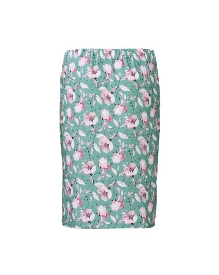 B: For those who like it longer but not boring, this variant is perfect: a narrow silhouette, knee length and made from cotton jersey with a floral pattern. The pleat at the front and side slit make the look comfortable - and a bit sexy at the same time.