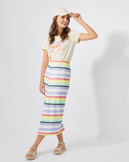 C: Unbeatable look for a last-minute holiday or festival weekend: this midi skirt in cheerful stripes can go from the beach to the street in minutes.