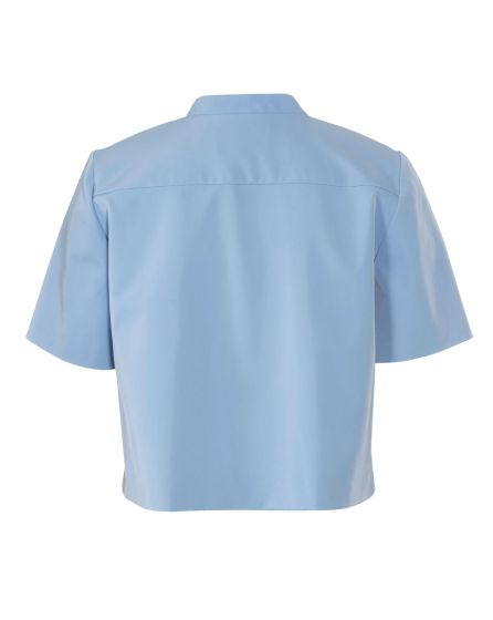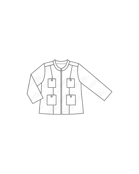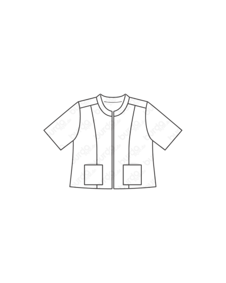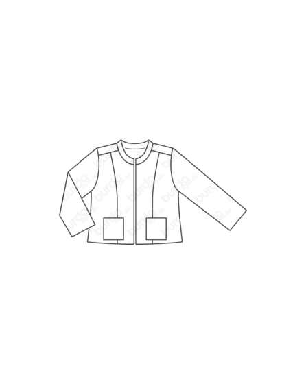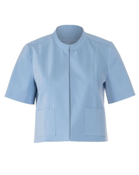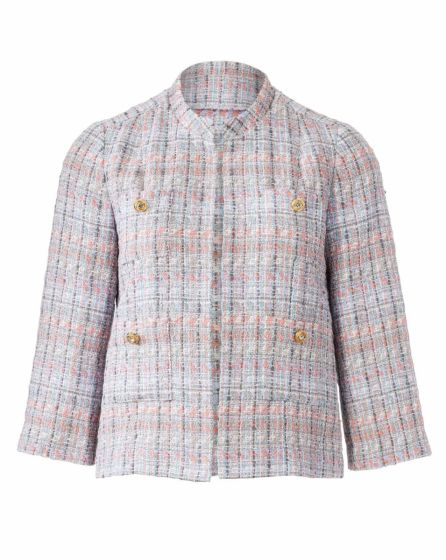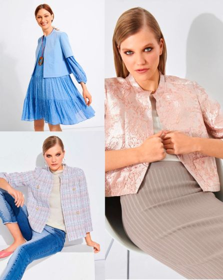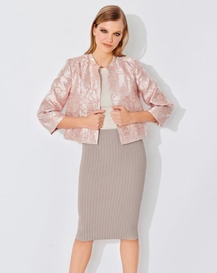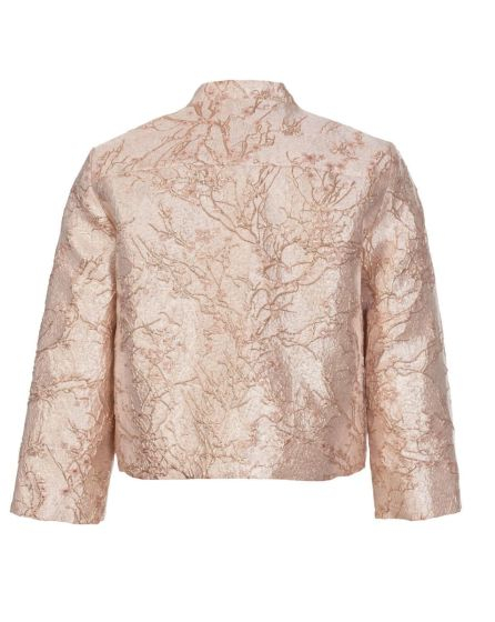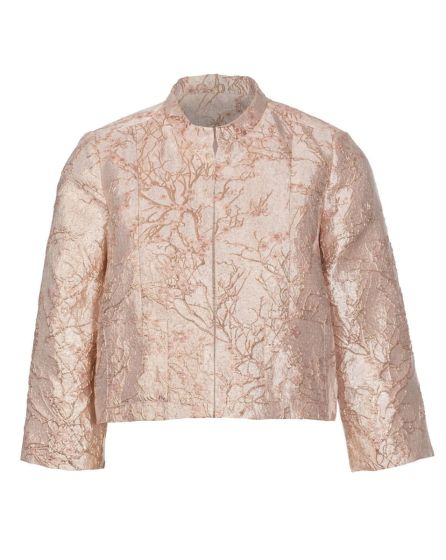 A: Over the top! This jacket made from metallic Lurex jacquard has a small Mandarin collar, 3/4 sleeves, two applied pockets, and a back yoke. And it tops off any outï¬ t. The look is particularly elegant when you combine it with nude and cream-coloured styling partners as we did here.
