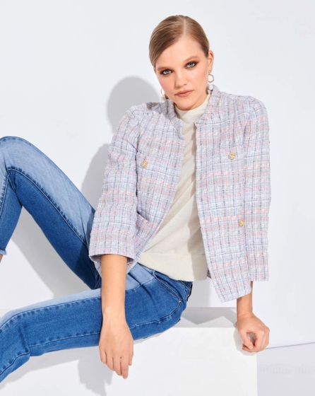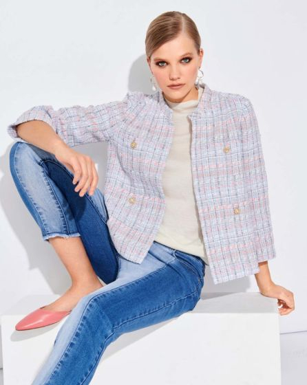 C: The days when bouclé jackets were only worn by older women with pearls are a thing of the past. Today they go best with jeans looks and even cargo trousers. Fashion is a game - and in this jacket with elegant gold buttons and four applied pockets, you will surely be the winner!