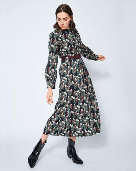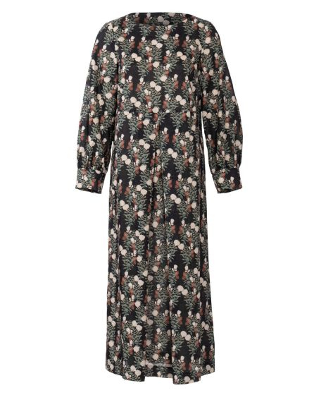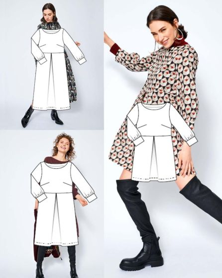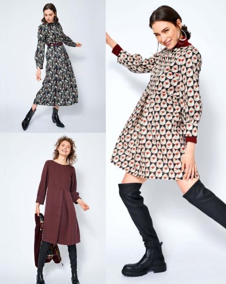 C: Full and fabulous: The patterned midi dress with long sleeves and inverted pleats looks wonderful plain and just as wonderful when styled with a leather jacket, blazer or a belt. An ultra-fashion-able look: Wear a solid-coloured slipover on top!
