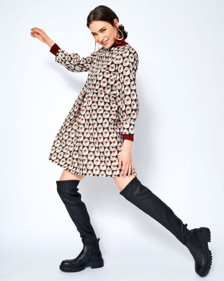 A: The cute mini dress with a Sixties pop feel has a high waistline, long sleeves and an inverted pleat at centre front and centre back. Perfectly styled: a matching roll-neck that ? ashes out above the bateau neckline. If you don't like overknee boots, style it with opaque tights and lace-up shoes.