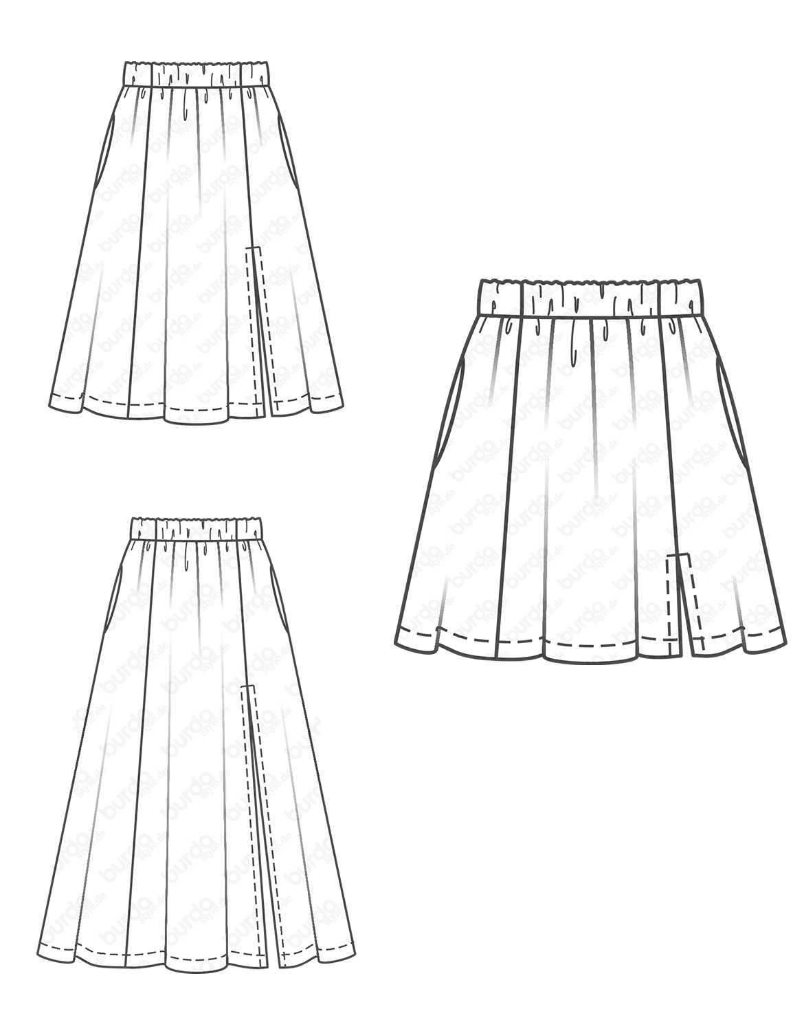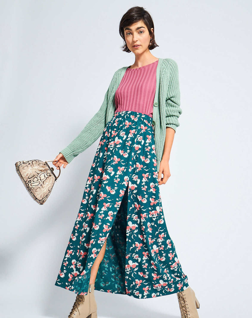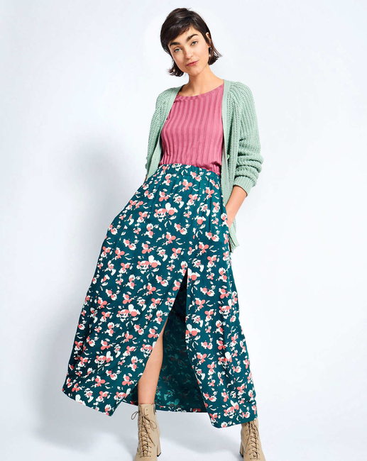 C: This ankle-length skirt with a long slit looks just as good with sandals and ballerinas as it does with chunky boots, Chucks, or thick-soled trainers. Depending on the styling, it is romantic, grungy, sporty or ultra-modern.