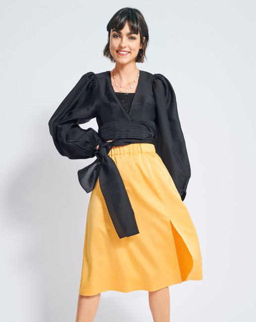 B: What a nice look! The wide cut (with an elastic casing at the waist, a slit at the front and side pockets) is casual yet feminine. âIlluminating' yellow, one of the Pantone trend colours in 2021, makes it a piece for picking up everyone's mood.