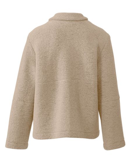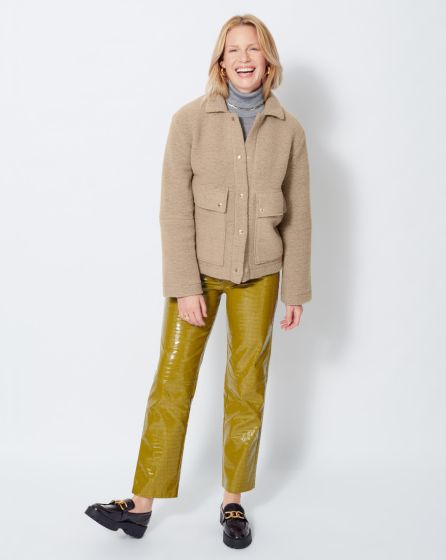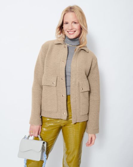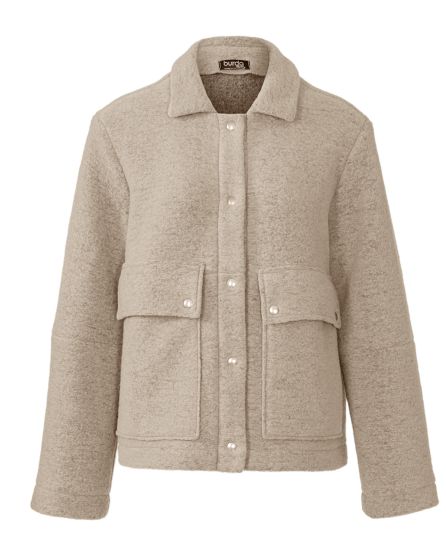 A: Short yet cuddly: The hip-length, beige jacket made from wool is the elegant version of the lumberjack shirt: chic and cool at the same time.